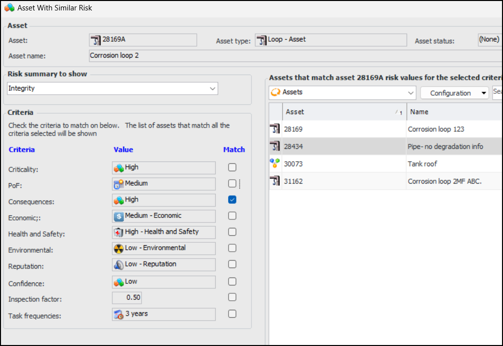 Using this tool, you can view all assets on the site that share criteria values. To view assets with similar risk, open the Asset window, click the Tools menu and then Similar Risk Profile. The Asset with Similar Risk window opens. For example:You can select one or more criteria from the Match list. The “Assets that match” table has columns showing risk information.Viewing the Site’s Risk Summary Charts