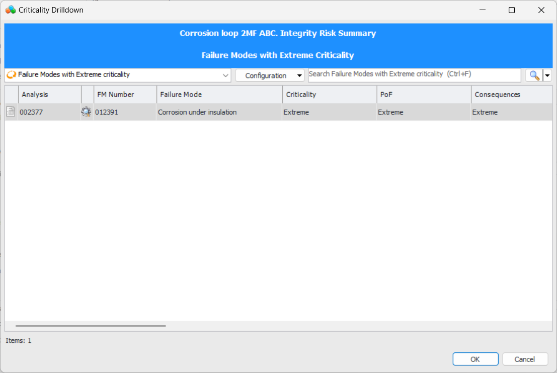 4. Clickfor any of the values to open a dialog listing failure modes that represent that value. In the example, you could open the dialog next to Criticality to view a list failure modes with the criticality score of “Extreme”: