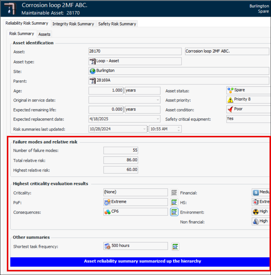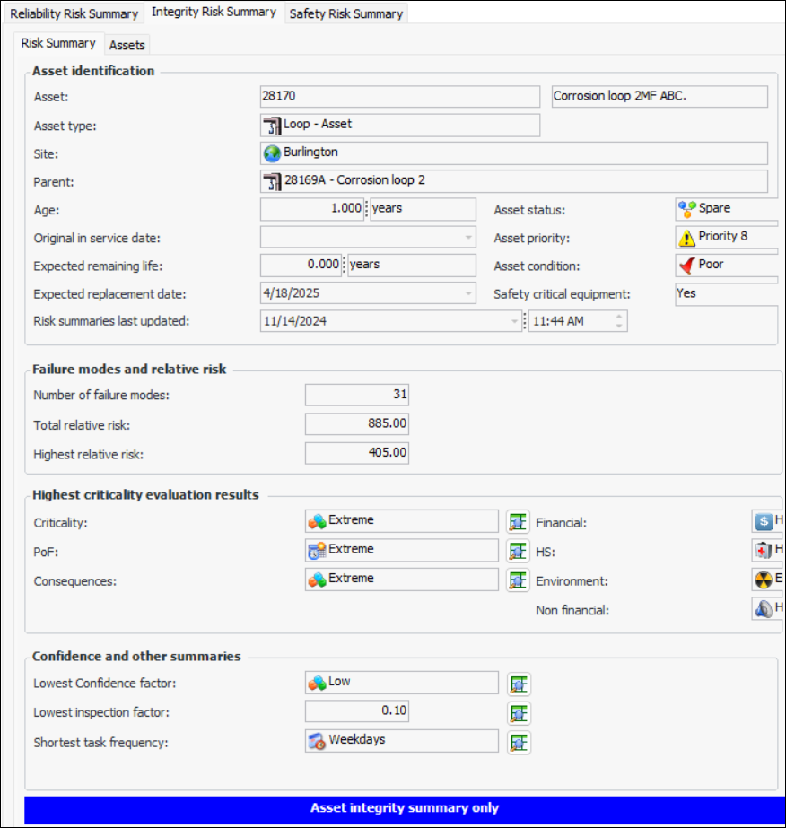The Other summaries area displays the shortest task frequency on the summarized assets.The Integrity Risk Summary tab includes the following:The Safety Risk Summary tab includes:To Update Asset Risk Summaries