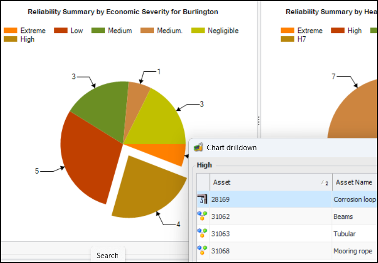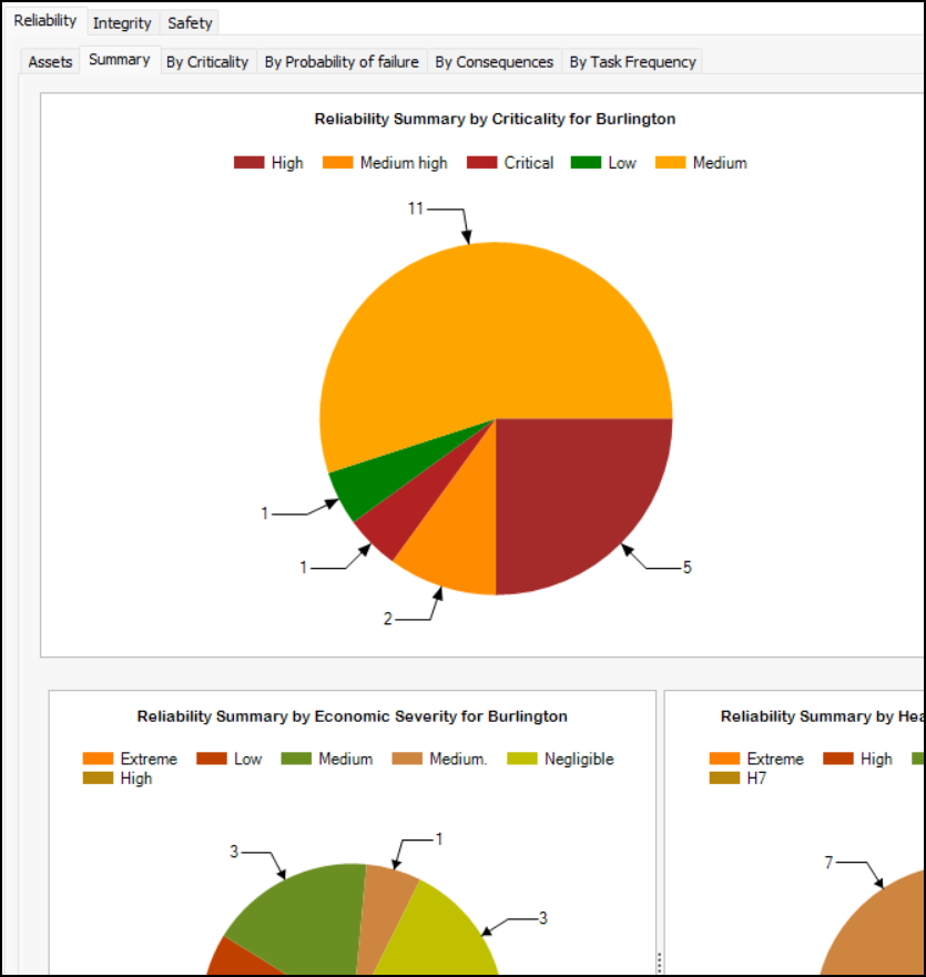 In the Hierarchy Risk and Asset Risk views in the Site window, you can select the Summary tab to view the following charts:Each of the Reliability, Integrity, and Safety tabs contains a Summary tab. Here is an excerpt from the Site window’s Asset Risk view, Reliability tab, Summary tab: