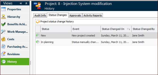You can view historical status changes on the project’s History view, which shows both manual and automatic status changes. If the Event column lists an event, such as “Project Created”, the status change occurred automatically. If the Event column states “Status Changed Manually”, then the status was changed manually. For more information on manual status changes, see Changing Project Status.To View a Project’s Status Change History