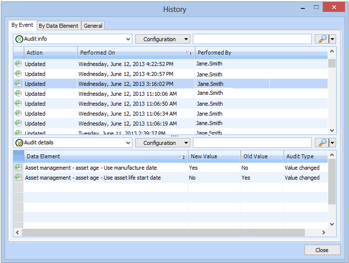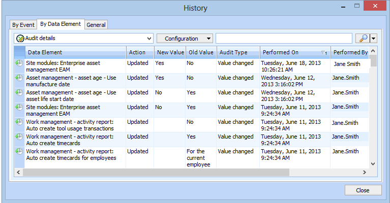 3. Select the By Data Element tab to view audit details for each data element. For example: