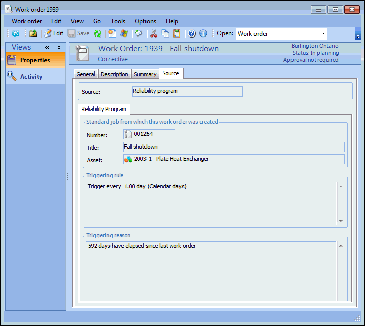 6. Select the Source tab. You can review the originating standard job, the triggering rule that created this work order, and the reason the work order was triggered. For example: