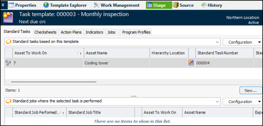 2. Select the Usage view, Standard Tasks tab. This tab shows a list of standard tasks that are linked to the template, as well as the standard jobs where the tasks are performed. For example: