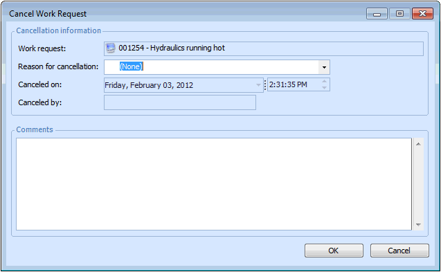 2. Right-click the request that you want to cancel and select Mark as Canceled. The Cancel Work Request dialog appears.