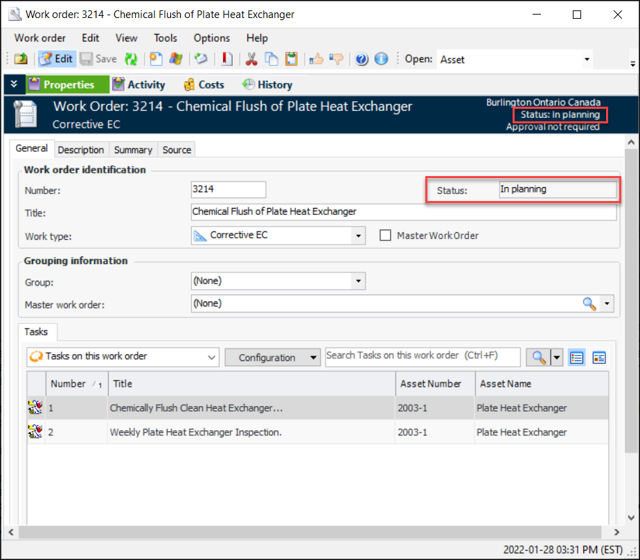 2. From the Properties view, General tab, you can view work order identification and grouping information, and work order tasks for the work order.