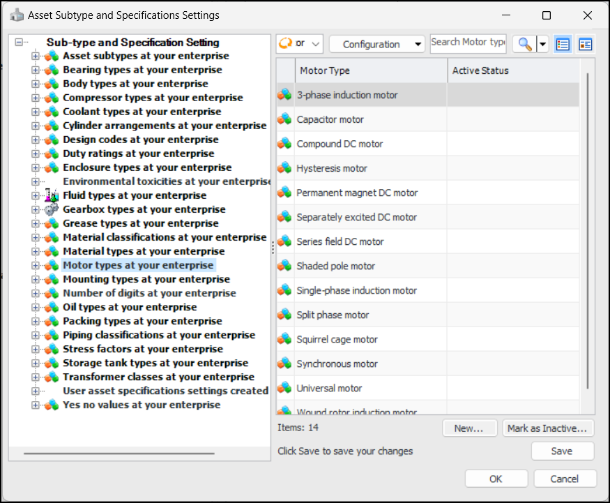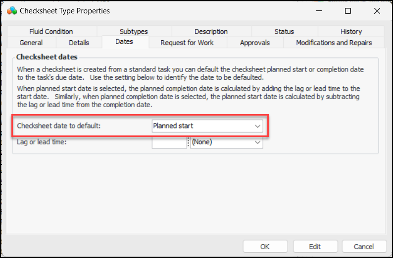 Asset administration dialogs and settings tabs have been reorganized so that value lists are easier to find. For example, to add a new motor type, you no longer need to select the Motors tab and then the Motor Types tab. Instead, the Motor Types tab is visible under the Subtypes and General Specifications tab:AWEIS – Standard Task Due Date Calculation