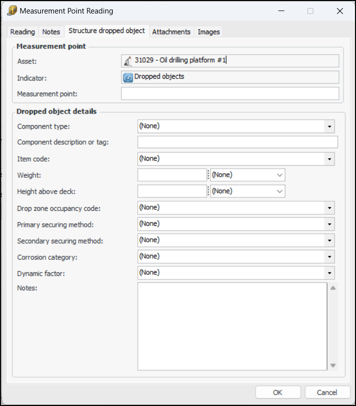 The new Structure Dropped Object indicator subtype provides value lists, properties, and panels for measurement point readings. When an indicator supports measurement points and the Structure Dropped Object subtype, its Measurement Point Reading windows display the Structure Dropped Object tab:To populate the value lists, open the Site window and select the Inspection Management view and Settings tab. On the Subtypes tab, scroll down and select one of the following nodes:Assign Checksheets to a Mobile Device