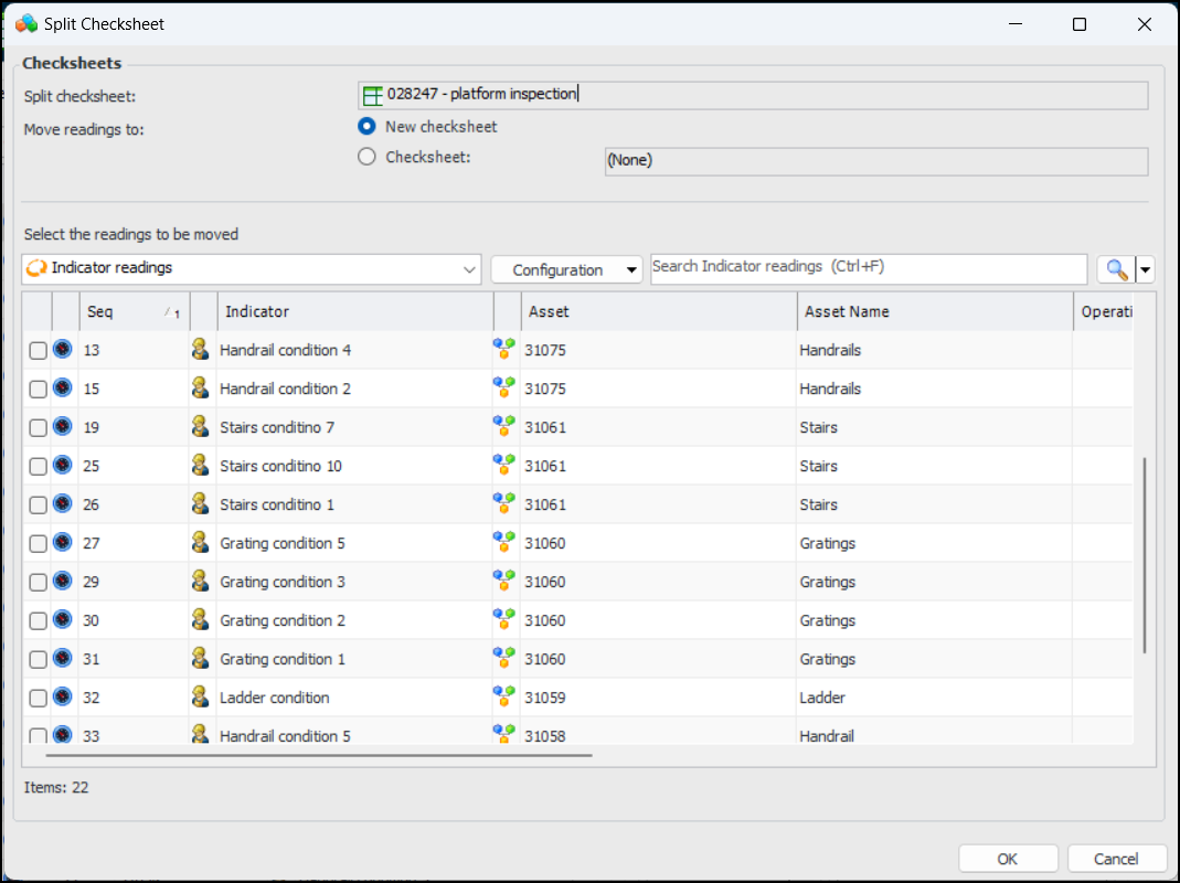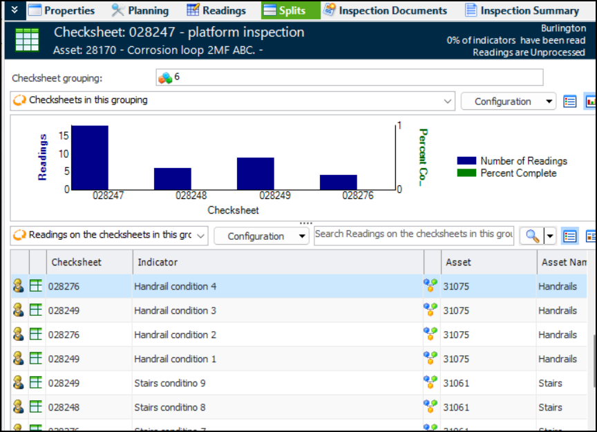 • When a checksheet has been split, the two (or more) resulting checksheets are numbered individually, but they are also identified by their common checksheet grouping. You can view checksheet groups in the Site window, Inspection Management view, Checksheets tab, Splits tab.AWEIS – Solution Package Template