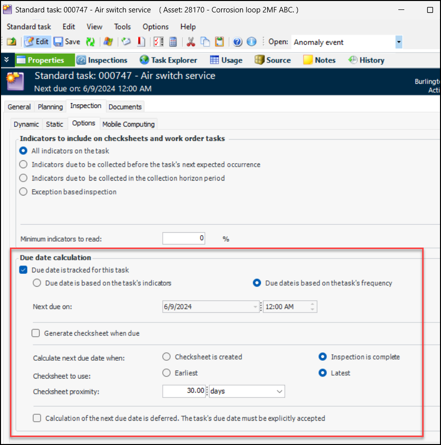 Note: Variable due date calculations is a “generally available” product feature. You must first enable feature 117 to use the functionality in APM. In the Enterprise window, select the Features view and the Enabled Features tab. Click Browse, select “Ability to define standard task due date calculation until inspection is complete” and click OK. If APM is running as a smart client, click Refresh Enabled Features on the server. Then restart the client to use the functionality.To set up due date calculation options, open the Standard Task window, Properties view, Inspection tab, Options tab. For example:Standard Task Due Date Defaulted to its Checksheet Planned Date