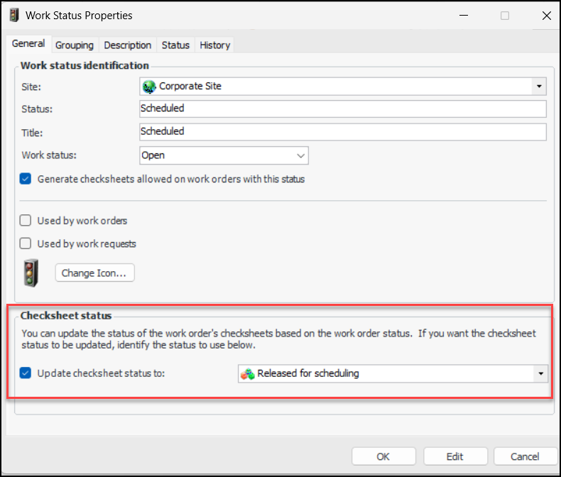 Previously, checksheets were assigned to mobile devices through their sources, for example, standard tasks. You can now assign a checksheet created from scratch to a mobile device. A new option – Can be assigned to mobile activity – on checksheet status enables this functionality:Performance and Stability Enhancements