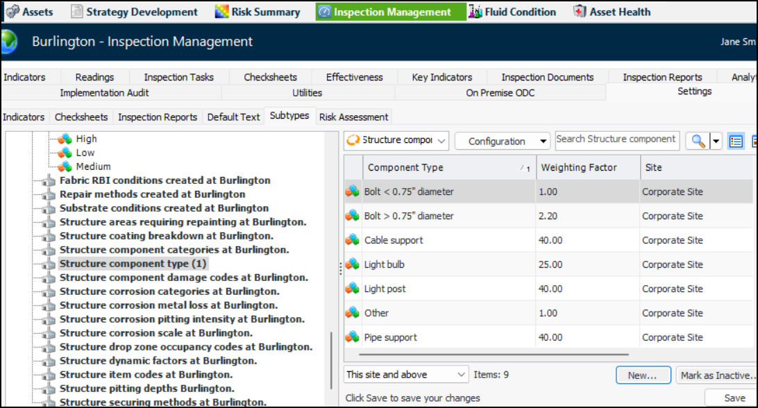 • Update analysis types to use the matrix. In the Asset Analysis Type window, enable editing and select the Risk Options and Inspection Factors tabs. Select the option for 4D matrix