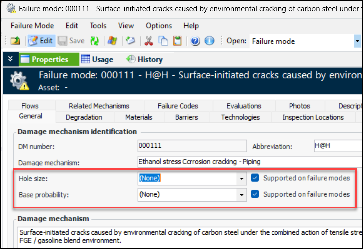 The following properties have been added to damage mechanisms: Hole size, Base probability, and Credibility. To access them, open the Site window, select the Strategy Development view, and the Damage Mechanisms Library tab. Open or create a damage mechanism. Select the Properties view, General tab:When Supported on failure modes is selected (default), the properties are copied to failure modes created from the mechanism.Select the Degradation tab to see the Credibility property:To populate the value lists for Hole size and Credibility, select the Settings tab in the site’s Strategy Development view. Select the Damage Mechanisms tab. The Credibility and Hole Sizes tabs allow you to create or edit values. For example: