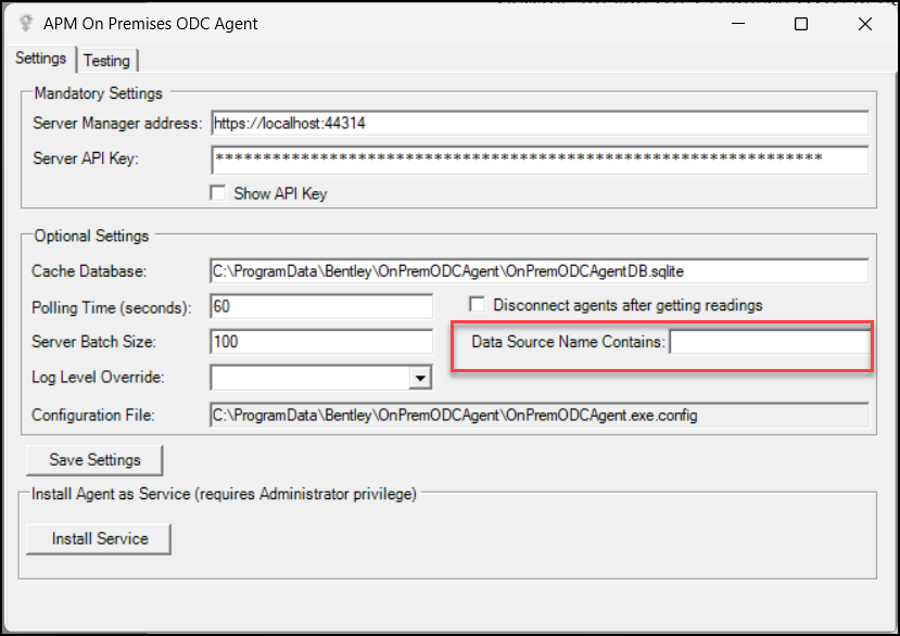 You can now configure the On-Premises ODC agent to use one or more specific data sources. On the APM On Premises ODC Agent dialog, use the Data Source Name Contains box to enter characters to filter data sources. For example, you could enter “DS” to select two or more data sources that contain those characters in their names.Product Usage