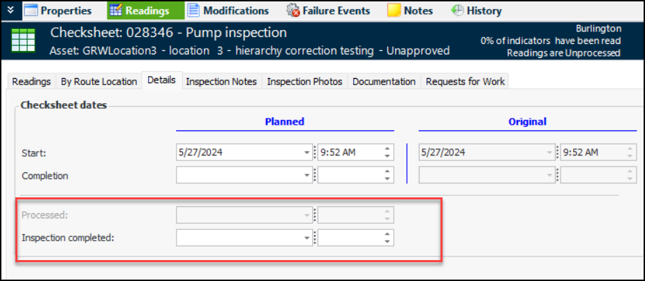 You can now assign calculations to indicator states when the indicator supports multiple measurement points. For example, a degradation indicator requires measurement points. On the States and Alarms tab, a calculation has been assigned to determine the states that will be applied to the aggregated readings:Note: Calculations are not supported when Track and acknowledge alarms by measurement point is selected. Measurement point readings must be aggregated to use calculations.Checksheet Original Planned Dates