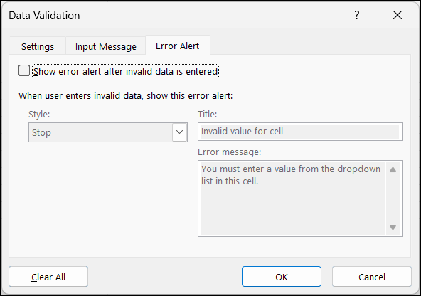 In the Excel workbook, select the cells in a column. Select Data in the ribbon and click Data Validation to open the Data Validation window. Select the Error Alert tab. Clear Show error alert after invalid data is entered.Click OK. You can now enter your own values or select values from the pick list.Standard Task Data Loader – New Properties