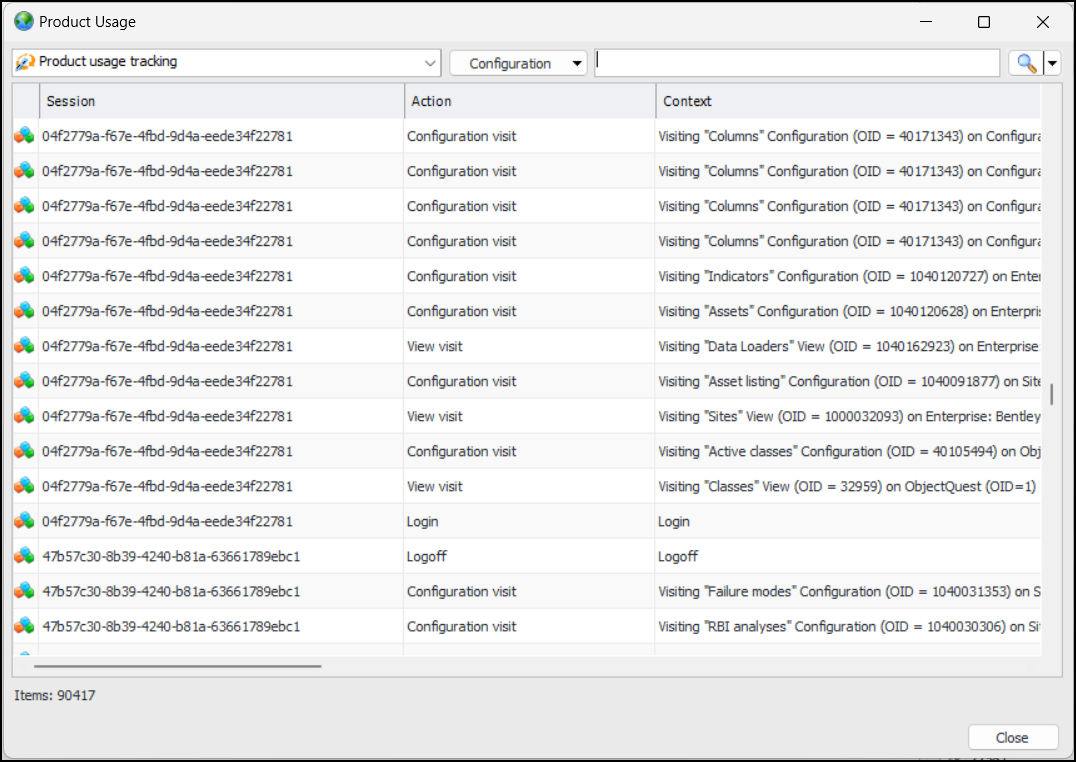 You can now view product usage tracking in APM. In the Enterprise window, click the Administration menu and then Product Usage. The Product Usage dialog appears. For example:Standard Tasks – Indicator Bar Code Scanning