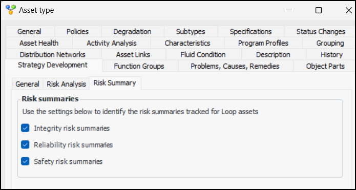 The Assets tab shows a list of assets in the same branch of the hierarchy with their summaries.You can update an asset’s risk summaries: click the Tools menu and then Update Risk Summaries. All of the risk summaries for the asset are recalculated. To update all of the risk summaries for the site, click the Tools menu, Strategy Development, and Update Risk Summaries. You can also set up the Update Risk Summaries scheduled action to perform the function automatically on schedule.Viewing Assets with Similar Risk