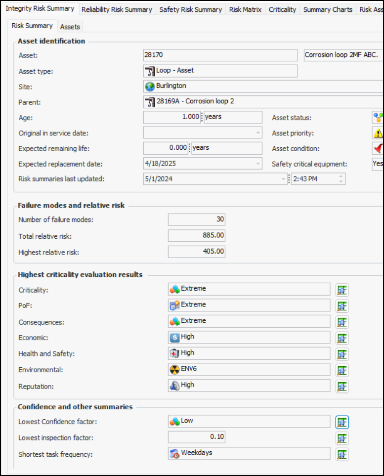 The data is derived from risk assessments on the asset’s failure modes. Summaries are available for:Note: The asset risk summaries are generally available in APM. You must first enable feature 121 to use the functionality. In the Enterprise window, select the Features view and the Enabled Features tab. Click Browse, select “Asset risk summaries” and click OK. If APM is running as a smart client, click Refresh Enabled Features on the server. Then restart the client to use the functionalityTo view risk summaries, open the Asset window, select the Risk Assessment view, and the appropriate Risk Summary tab. Here is an example of an Integrity Risk Assessment:Each summary is based on the asset’s failure modes for which criticality evaluation was performed, as long as the failure modes are marked “implementation completed”. Only primary action plans are considered, with the exception of Shortest task frequency, which includes secondary action plans as well. If versions are in use, only the current version of the failure mode is included.Clickfor any of the values to open a dialog listing failure modes that represent that value. In the example, you could open the dialog next to Criticality to view a list failure modes with the criticality score of “Extreme”.