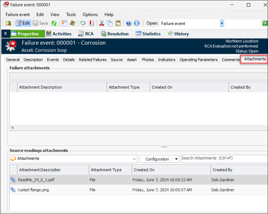 When an indicator alarm is acknowledged and a failure record created, you can now view the indicator reading’s attachments in the Failure Event window, Attachments tab. For example:Checksheet Status – Subtype Properties