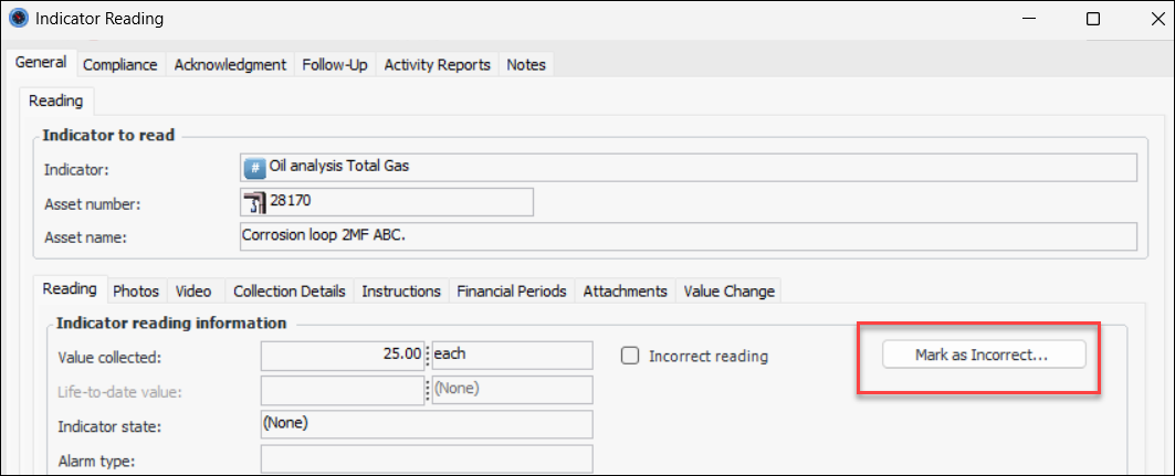 The Indicator Reading window now provides the Mark as Incorrect and Undo Mark as Incorrect buttons. This makes it easier to mark the reading as incorrect and to reverse the decision if needed.When you click Mark as Incorrect, a confirmation window appears where you can select a reason and provide comments. When you click OK, the window closes, Incorrect reading is selected, and the button label changes to Undo Mark as Incorrect.Online Data Collection (ODC)