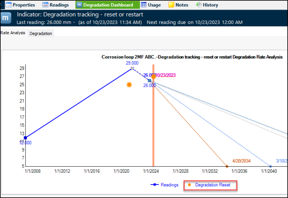 Note: The degradation reset function is available for technology preview. You must first enable feature 126 to use the functionality in APM. In the Enterprise window, select the Features view and the Enabled Features tab. Click Browse, select “Support ability to reset indicator degradation rate when piping replaced” and click OK. If APM is running as a smart client, click Refresh Enabled Features on the server. Then restart the client to use the functionality.To reset degradation tracking, open the Indicator window, click the Tools menu and then Reset Degradation. The Indicator Degradation Rate Reset window displays the current indicator degradation rate and the current date as the new starting date. For example:When the reset is saved, the Degradation Resets tab is added to the Indicator window. For example:In the Degradation Rate tab, you will find the Restarted Indicator Rate tab, as well as the Indicator Rate and Asset Design Rate tabs.Note: When an indicator has been reset, the Change Design Info button is no longer available. You can perform another reset to change design information.You can view resets at the site level by selecting the Inspection Management view, the Indicators tab, and the Degradation Resets tab.Indicator Measurement Points with Calculated States
