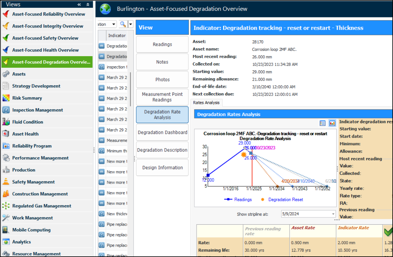 • Degradation – For the team interested in establishing and tracking assets’ degradation over time. The view lists degradation indicators and their assets and shows readings, degradation rate analysis, and a degradation dashboardNote: Only assets that support degradation tracking and have degradation indicators are shown in the view.Note: The Asset Health and Degradation overviews are generally available in APM. You must first enable features 132 and 133 to use the functionality. In the Enterprise window, select the Features view and the Enabled Features tab. Click Browse, select “Asset focused UX” and “Introduce a new Degradation view to site and asset” and click OK. If APM is running as a smart client, click Refresh Enabled Features on the server. Then restart the client to use the functionality.When you select another item, the content changes accordingly. Select buttons in the View panel to see information like readings, notes, and photos.Employee permission groups have been updated to include asset-focused overviews. See Setting up Employee Permission Groups.Create Objects from an Overview