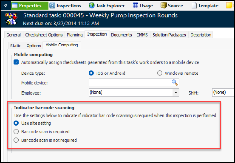 You will find the options in the Standard Task window, Properties view, Inspection tab, Mobile Computing tab: