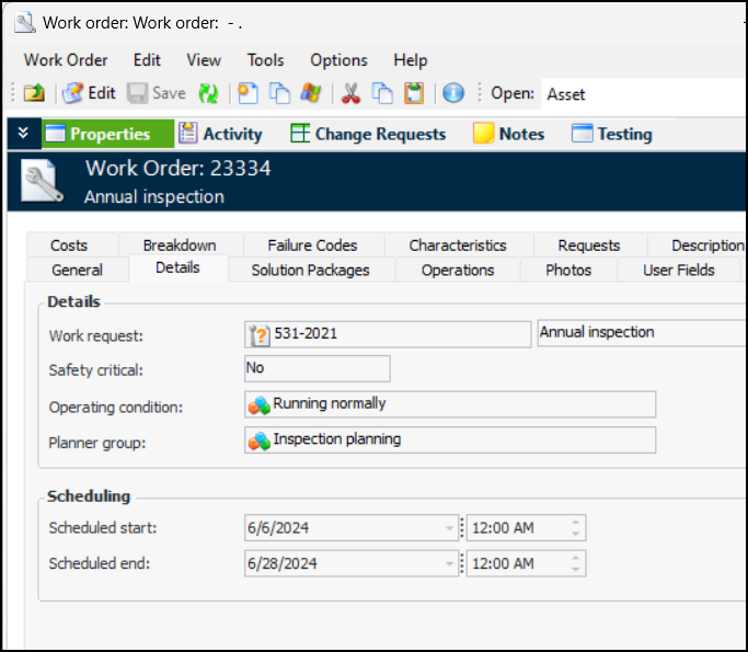 Open the solution package or template and select the tab for the subordinate level, in this example, Maintenance Items. Select an item in the table and click Mark as Inactive. You can provide a comment in the message box that appears. When you click OK, APM confirms that the item is inactive. The inactive package is shown as struck-through in the table. The Active Status column identifies the item as “Inactive”.When you are ready to reactivate the item, select it and click Mark as Active.AWEIS – Work Request and Scheduled Dates on Work Orders