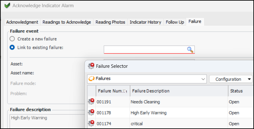 • Acknowledgment asset and above – Failures for acknowledgment’s asset and above in the hierarchy are availableTo set the option, open the Site window, select the Inspection Management view, Settings tab, Indicators tab, and Acknowledgment Policies tab. Click Edit to open the site for change.You will see the filtering in effect when you acknowledge an alarm, select the Failure tab and Link to existing failure. The Failure Selector dialog lists failures for assets as specified in the acknowledgment policy.Acknowledgment Windows Show Links to Work Documents