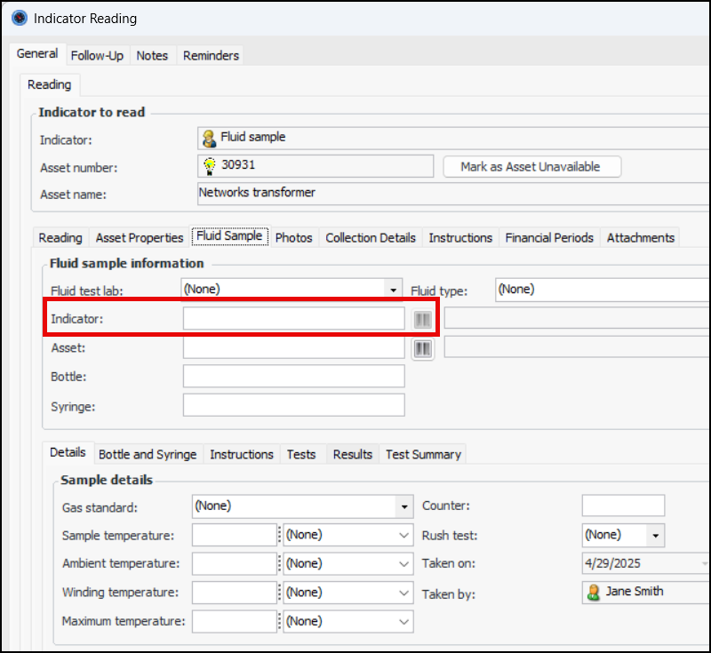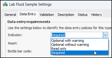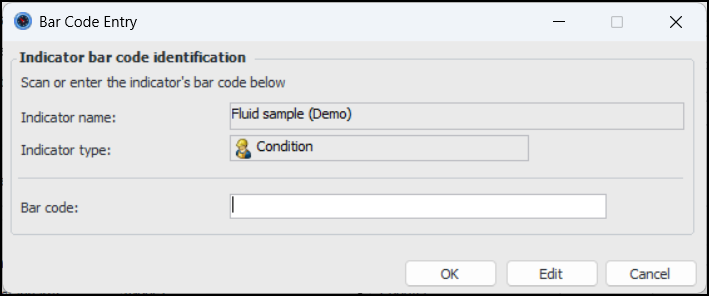 When entering a fluid sample indicator reading, select the “sample taken” indicator state to view the Fluid Sample tab. You can now enter or scan the indicator bar code:Enter or scan the bar code and click OK. The bar code is added to the indicator and the fluid sample information.To set up APM to use indicator bar codes, update lab fluid sample settings. On the Data Entry tab, select the data entry policy for indicator bar codes on fluid samples:Select the Validation tab to select an option for indicator bar code validation.Inspection Management