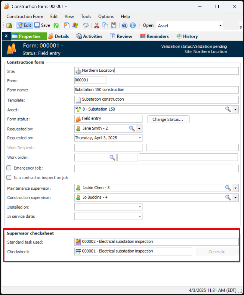 To set up this functionality, open the construction form template. In the Construction Form Template Header window, select the Properties view and General tab. In the Supervisor checksheet area, select Generate a supervisor checksheet. Select a standard task template to use. If you wish, assign collection to the maintenance or construction supervisor on the construction form. For example:Construction form status properties now include an action for generating the supervisor checksheet and a rule that controls checksheet generation. For more information, see Setting up Statuses for Construction Forms.Adding Descendant Assets to Construction Forms