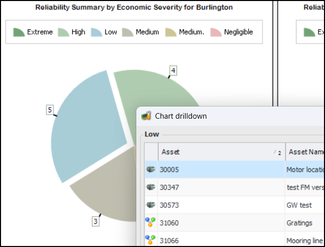In the Hierarchy Risk and Asset Risk views in the Site window, you can now select the Summary tab to view reliability summary charts by:Each of the Reliability, Integrity, and Safety tabs contains a Summary tab. Here is an excerpt from the Site window’s Asset Risk view, Reliability tab, Summary tab:Note: Asset hierarchy risk summaries are “generally available” product features. You must first enable features 121 and 137 to use the functionality in APM. In the Enterprise window, select the Features view and the Enabled Features tab. Click Browse, select “Asset risk summaries” and “Asset hierarchy risk summaries”, and click OK. If APM is running as a smart client, click Refresh Enabled Features on the server. Then restart the client to use the functionality.Audit History