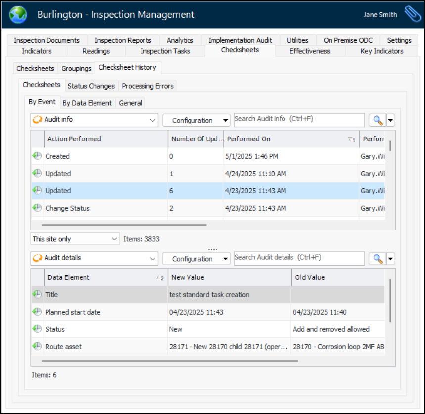 Historical information is now available for a number of APM objects at the site level. You can view audit information and details for checksheets, assets, and standard tasks. For example, in the Site window, select the Inspection Management view, Checksheets tab, and Checksheet History tab:In the By Event tab, when you select an action in the Audit info table, the Audit details table displays specific information for that action.Select the By Data Element tab to view audit details for each data element (for example, Next collection due). Select the General tab to view creation and last update information for each checksheet.By default, each tab displays information for the current site. You can select This site and above or This site and below from the list at the bottom of the main table.To view asset audit information at the site level, select the Assets view and the Asset History tab. You will see the same information that is available on the History view of an asset’s window, with the exception of data loaders and activity reports.To view standard task audit information at the site level, select the Reliability Program view, Program tab, and Task History tab. The same information that is available on the History view of a task’s window, with the exception of activity reports, review requests, and data loaders, is displayed here. You will also find historical information for inspection tasks in the Inspection Management view.Audit information is now available for operating parameters. In the site window, select the Assets view and Operating Parameters tab. Open an operating parameter’s window and select the History tab. Standard information is available on the By Event, By Data Element, and General tabs.Function and Functional Failures