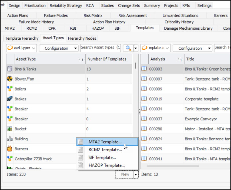 You can now create templates for MTA2, RCM2, SIF, and HAZOP analyses from the Site window, Strategy Analysis view, Templates tab, Asset Types tab. Select the asset type in the table, click the New list and select the type of template:Strategy Development Analysis – Design FMECA