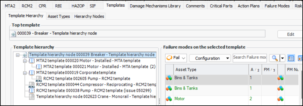 The top template is shown above the tree. You can click Edit to select another template and then click Save to update the tree.Select a template in the left-hand table to view the asset types and their failure modes on the right. Select the Asset Types tab to view a table of asset types and the number of templates for each type. Select an asset type to view a list of its template analyses.The Hierarchy Nodes tab makes it easy to view and add nodes for use in template hierarchies.Template Creation from Site