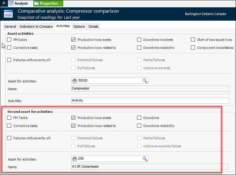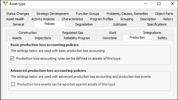 In the Asset window, the Downtime and Production Loss tab is used to summarize downtime for the asset, calculate the amount and cost of lost production, and add production loss calculations to the asset and product. For example:This tab’s availability is controlled by the asset type. In the Asset Type window, Policies tab, the Performance tab has been replaced by separate Downtime and Production tabs.The Production tab allows you enable production loss accounting rules for basic production loss accounting. When the option is selected, the Downtime and Production Loss tab is available for assets of that type.When Production loss events can be reported against assets of this type is selected, the Production tab is available for assets, showing products, calculations, and cost intervals.Related Asset on Production Loss Events and Downtime Incidents
