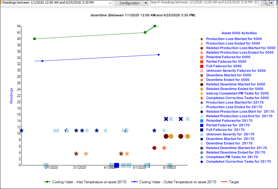The Production view on the Site window now provides the Asset Products tab that lists all of the products for the site. You can use the filters at the bottom of the tab to view products for sites below and above the current site.On the Asset Products tab, you can create products without having to open Asset windows. You can also copy products to other assets on the same site or other sites that support advanced production loss accounting. And you can use the Replace Column Data feature to change values in all of the listed products.Downtime and Production Tab on Asset