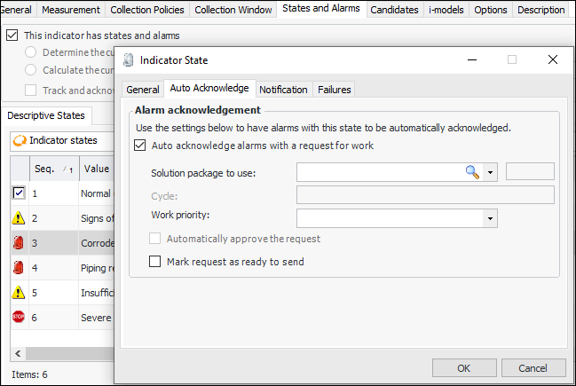 • Open the indicator state and click the Auto Acknowledge tab. (This tab is only available when AssetWise Interoperability is enabled for the site)