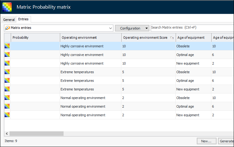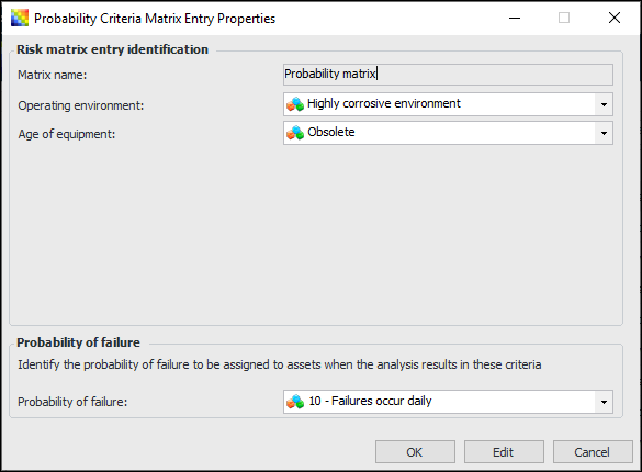 Note: To use this functionality in APM, you must first enable feature 39. In the Enterprise window, select the Customization Center view and the Enabled Features tab. Click Browse, select “Criteria based probability evaluation on an asset prioritization analysis”, and click OK. If APM is running as a smart client, click Refresh Enabled Features on the server. Then restart the client to use the functionality.The probability analysis is designed to complement the consequence evaluation in prioritization analyses. On the Probability tab, select a criterion in the top table to display examples in the table below. Drag and drop the appropriate example to the criterion’s line to enter its score. For example:When you have completed the probability and consequence evaluations and click Calculate Scores, APM assigns the probability of failure and consequence priority to the analysis. The probability score is used in the calculation that determines relative risk.Setting up APM for Probability Analysis