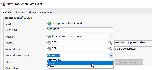 The Acknowledge Indicator Alarm dialog has changed to be consistent with the dialog on APM Remote. The solution package options appear on the Acknowledgment tab, General tab. For example:A separate Events tab allows you to add events:Production Loss Accounting, Advanced Version