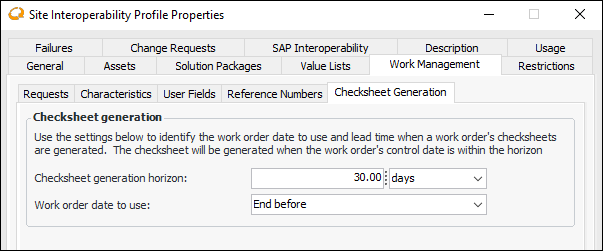 In the Site Interoperability Profile dialog, you can more precisely define when checksheets will be generated for interop work orders. Checksheets will be generated when the work order’s control date (for example, Start before) is within the generation horizon. Select the Work Management and Checksheet Generation tabs:AWEIS – Interoperability Data Readiness