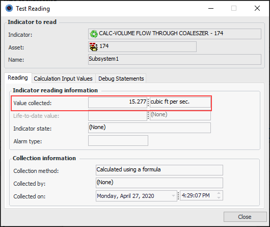 When developing 4D calculated indicators, you can test calculation inputs using readings retrieved from the Influx database. In the Indicator window, Calculation tab, click Check (Live). The Check Live 4D Indicator Reading dialog appears, showing the current date and time.Select the Calculation Input Values tab to see the input values.If the calculation formula specifies written output, the Debug Statements tab shows the result. For example:Create Influx Readings to Test Calculations