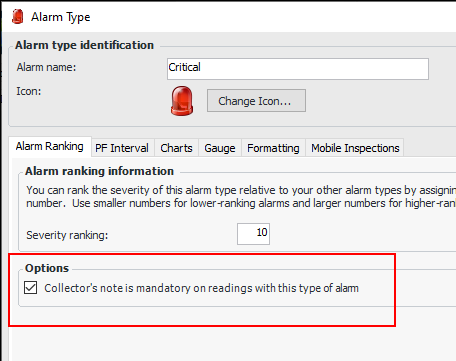 2. Open the Alarm Type window and click Edit. On the Alarm Ranking tab, click Collectors note is mandatory on readings with this type of alarm. For example: