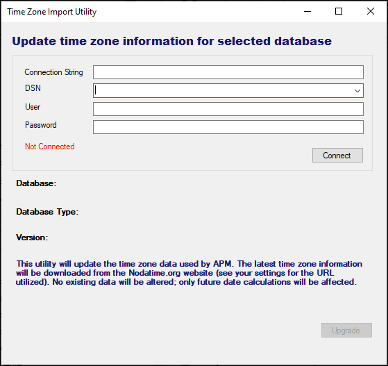 6. Click Connect. When the utility successfully accesses the APM database, “Not Connected” is replaced by “Connected”, database information is added to the dialog, and the Upgrade button is enabled. For example: