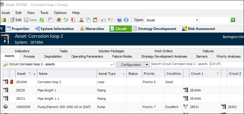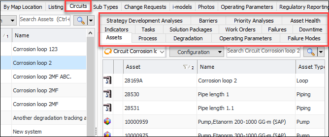 • For an asset that represents a circuit, select the Circuit view in the Asset window to view the assets included in the circuit. Similarly, Strategy Development Analysis windows display the Circuit view when the primary asset represents a circuit