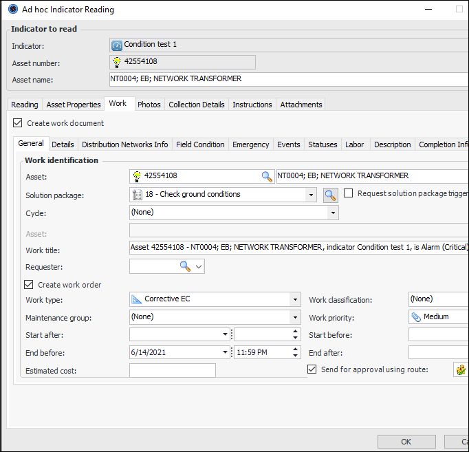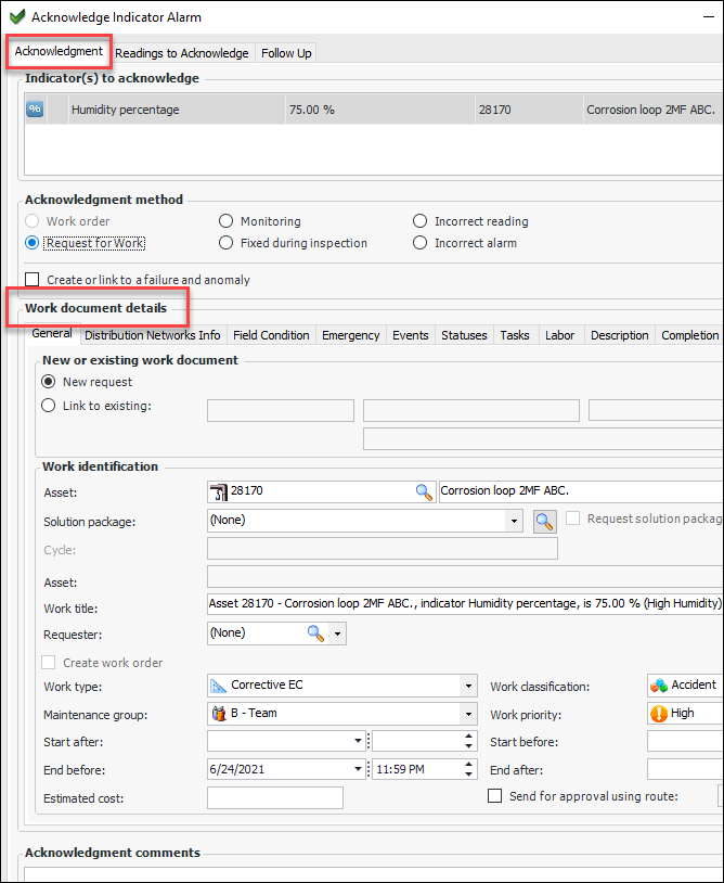 On an indicator state, you can select the Work Document tab to specify default information for the request for work. This functionality is available for alarm states and non-alarm states when the creation of work documents is allowed.In the Indicator State window, select the Work Document tab, and select Default request info for work info. For example:When you enter an indicator reading, the Work tab is available if the indicator state requires it. If work document is mandatory (on a non-alarm state), Create work document is selected and read-only. Default information from the indicator state’s default work document info and the default solution package is displayed. For example:When you are acknowledging an alarm, the Acknowledgment tab displays the Work document details area, which displays the default information for the request for work. For example:Link Checksheets to Interop Work Requests
