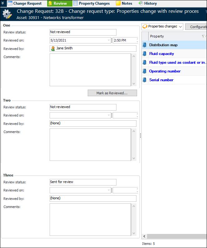 When the review process is active for a properties change request, all levels of review (up to three) are displayed in the Review view at the same time. Here is an example with three levels:Asset Status Available on Properties Change Requests