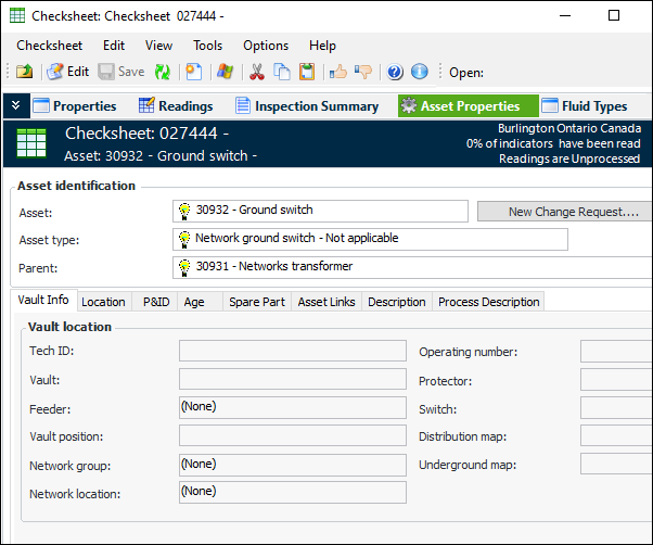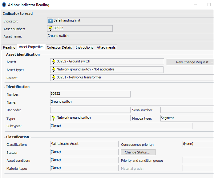 The Asset Type window provides settings to display a set of asset properties in any of checksheets, indicator readings, and requests for work. An Asset Properties view (on Checksheet) or tab (Indicator Reading and Request for Work) is added to the user interface if the asset’s asset type has enabled support for displaying asset properties.In the Asset Type window, you will find the options on the Policies tab, Assets tab at the bottom of the tab. For example:Below is an example of an indicator reading window with the Asset Properties tab. The panel assigned to the asset type is “Properties general information”.Note that, in this example, you can initiate an asset properties change request by clicking New Change Request.This example shows the Checksheet window, Asset Properties view when the panel to display is “General properties tab sub notebook”.Note: This functionality is available as a Technology Preview. To use it in APM, you must first enable feature 65. In the Enterprise window, select the Features view and the Enabled Features tab. Click Browse, select “Display asset properties on selected objects”, and click OK. If APM is running as a smart client, click Refresh Enabled Features on the server. Then restart the client to use the functionality.Work Document Creation for Non-Alarm Readings