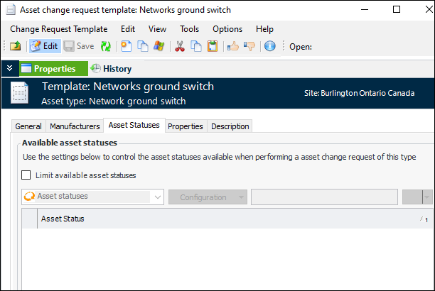 For distribution network assets, the New Properties Change Request window, Change Request tab now includes the Asset status selection list. For example:You can limit the asset statuses available in the list in the asset change request template. Select the new Asset Statuses tab, click Limit available asset statuses, and select the statuses to use.Create Property Change Requests from Construction Form